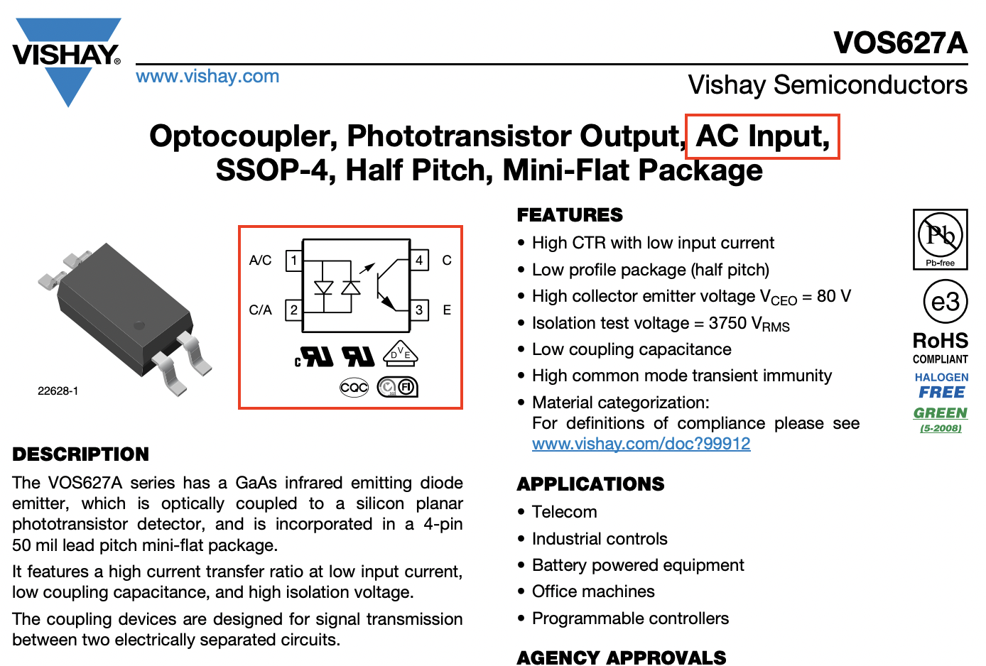 찾는 방법은 별거 없어. mouser에 가서 ac input optocoupler로 검색한 다음에 필터를 이것 저것 적용한 다음 적당해 보이는 IC Datasheet 보면서 찾는 거야. 노다가지 ㅋㅋ