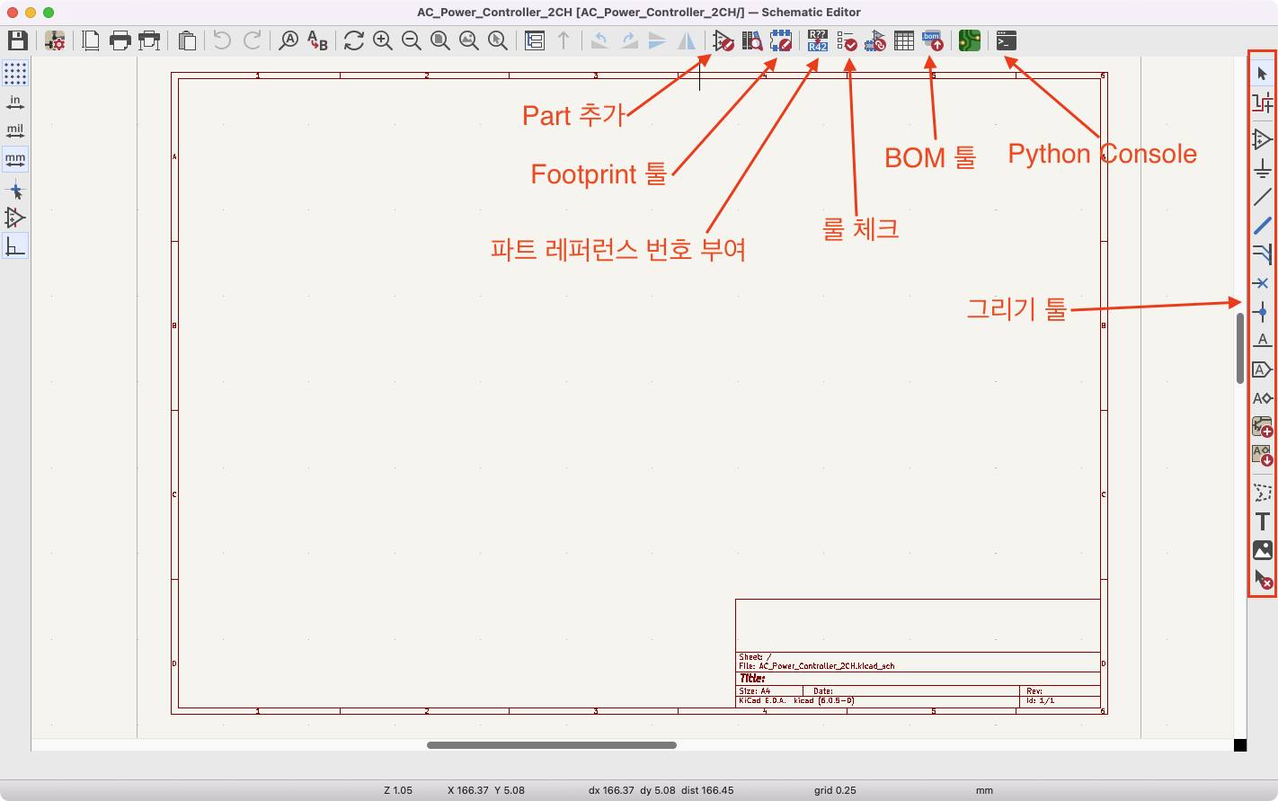 딱히 다른 다른 회로 툴이랑 다른건 모르겠어. part 툴, footprint 툴도 보이고 회로 그리는데 필요한 툴들이 쫙 있네. 특이한 건 python console 정도? python 스크립트 쓸일이 있다는 이야기는 들었는데 ㅎㅎㅎ 어휴 이제 python까지 해야하나? ㅋㅋㅋ