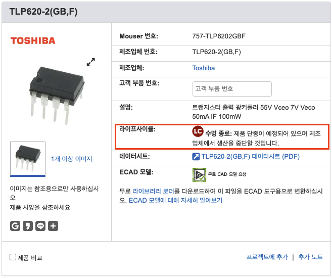 검색해보니 단종이네. 이런거 조심해야 함. 아이고 TLP620은 못쓰고 다른거 찾아봐야겠네. 그럼 다음거 트라이악도 필요하니까 BT137 검색. 음 또 없네. 그러면 마우저 검색. BT137은 있는데 BT137F는 음 마찬 가지로 단종되었나보네. TLP620도 없고 BT137도 없고 ㅎㅎ 이럴 경우에 만약 부품을 공급하는 업체에서 재고나 대치품을 충분히 공급할 수 있다는 보장이 있다면 사용해도 되지만 그렇지 않으면 비슷한 스팩의 적당한 소자를 찾아야겠지.