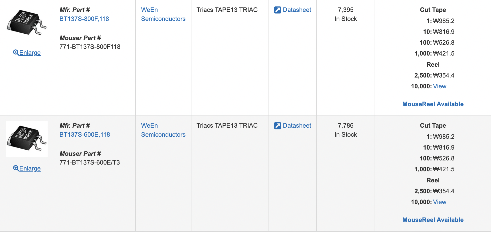 트라이악은 BT137F는 없는데 BT137 시리즈는 그대로 있네. 난 트라이악에 대한 지식은 많이 없어서 무서우니까 그냥 BT137을 그대로 쓰고 검색해보니 BT137S-800하고 600이 있는데 repetitive peak offstate voltage가 800V 아니면 600V 차이야. 뭐 800이 조금 더 튼튼하겠지 암튼 패키지는 동일하니까 이걸 사용하도록 하자구.